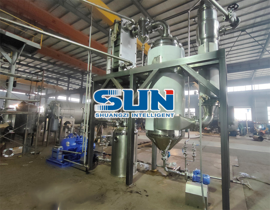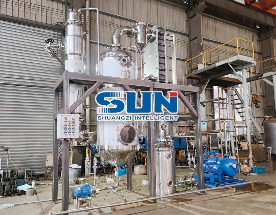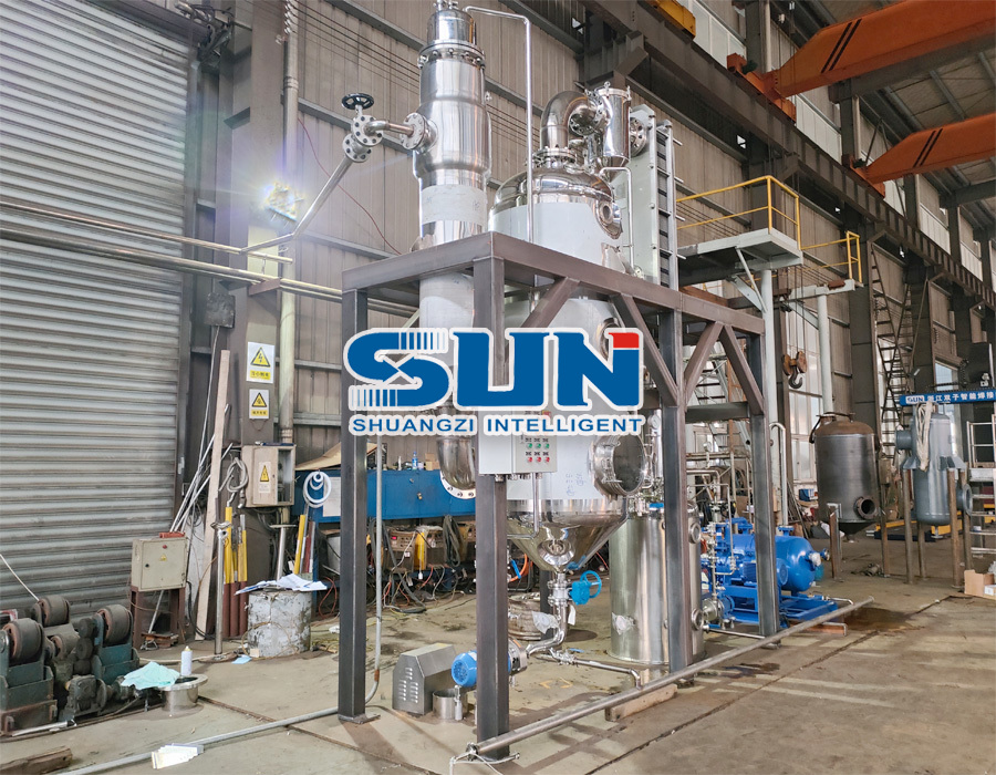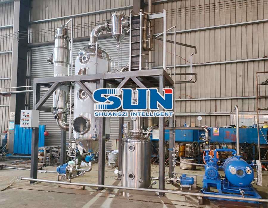 장비는 주로 히터, 분리기, 응축기 등으로 구성됩니다. 작동 중에 공급 액체는 분배기를 통해 가열 튜브의 내벽에 골고루 분포되어 중력과 2 차 증기에 의해 구동되는 균일 한 떨어지는 필름을 형성합니다. 가열 튜브의 외부에 증기가 도입되고, 튜브 벽을 통해 열을 옮겨 급속 끓여서 공급 액체를 기화시킨다. 생성 된 2 차 증기 및 농축 액체는 분리를 위해 분리기로 들어갑니다. 2 차 증기는 응축되고 배출되는 반면, 농축 액체는 표적 농도에 도달 한 후에 수집된다.