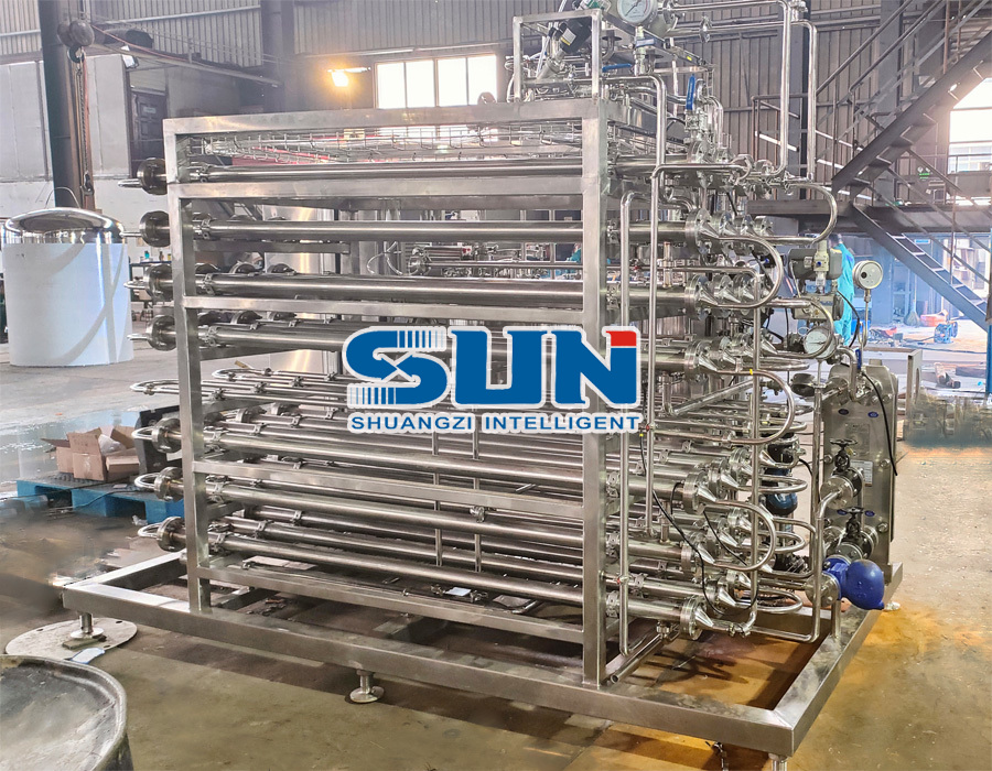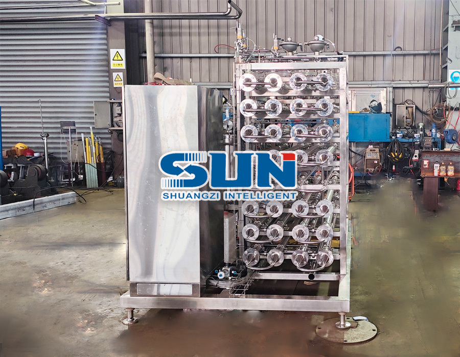 UHT 관형 살균기는 우유, 주스, 차 음료, 중국 허브 추출물 및 기타 제품에 널리 사용됩니다. 이 장비는 주로 다양한 농축 물질의 멸균 및 냉각 공정에 사용됩니다. 이는 재료 저장 탱크, 과열 물 탱크, 펌프, 관형 열교환기, PLC 제어 시스템, 제어 캐비닛, 증기 흡입 시스템, 밸브, 유도 스위치 등으로 구성됩니다. 이 기계는 모든 종류의 농축 재료 살균 및 냉각 공정에 적합하며 제품 점도 범위가 넓고 섬유 및 입자에 적응할 수 있습니다. 코킹이 쉽고 생산시간이 길다. 높은 열 전달 계수: 관형 열 교환기, 재료 및 열 교환 매체는 난류 상태에서 작동하고 열 교환 효율이 높고 스케일링이 감소하며 멸균 기계의 연속 작업 시간이 늘어납니다. 수입 장비와 완전히 비교할 수 있습니다. 높은 열효율: 재료를 가열한 후 열에너지의 90% 이상을 회수할 수 있습니다. 튜브에 접점이 없고 위생적인 데드 앵글이 없으며 제품이 튜브에 달라붙지 않으며 스케일링이 쉽지 않습니다. 벨로우즈는 멸균 과정에서 높은 난류를 형성하고 재료 흐름 과정에서 자체 청소 효과가 있으므로 튜브에 스케일과 오염이 형성되기 쉽지 않습니다.